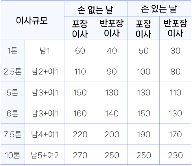 이사 비용은 일정, 추가 인력, 차량종류, 이동거리, 예약시점 등 여러 조건에 따라 달라질 수 있습니다.